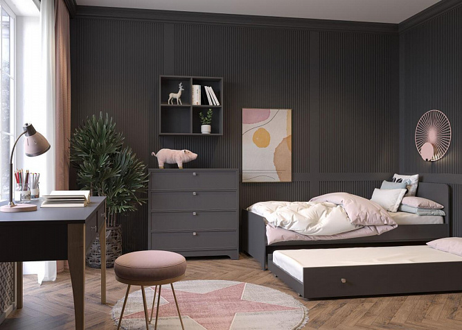 Комплект выполнен в трех декорах: "Графит" (корпус), "Урбан Графит" (фасады) и "Дуб Винченца" (ножки стола).