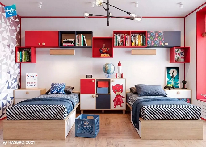 Фасады и корпус изготавливаются по индивидуальным размерам из ЛДСП. Надежный в эксплуатации, экологичный материал обладает высокими эстетическими качествами. Сохраняет презентабельный вид в течение всего срока эксплуатации. В качестве дополнительного декора использованы принты в виде персонажей мультфильма "Герои в масках".
