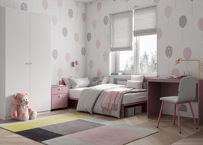 В качестве декоров для всех элементов, как корпуса, так и фасадов, выбраны следующие цвета: “Лотос” (розовый), “Алебастр” (белый), “Фламинго” (тоже розовый, более светлый, кровать).