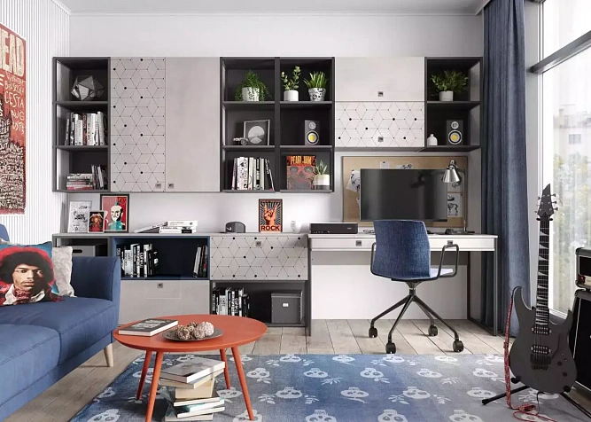Корпус мебели выполнен в двух декорах: "Графит" (темно-серый, почти черный) и "Орион" (синий).