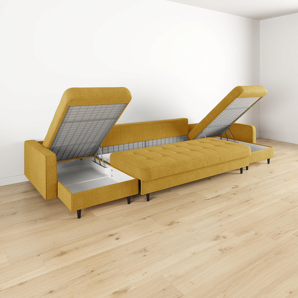 - Легкая уборка под диваном. Высокие опоры позволяют сохранять чистоту, в том числе и с помощью робота-пылесоса.