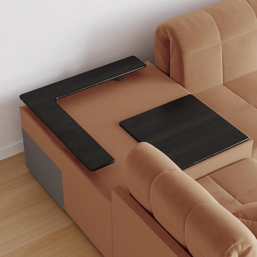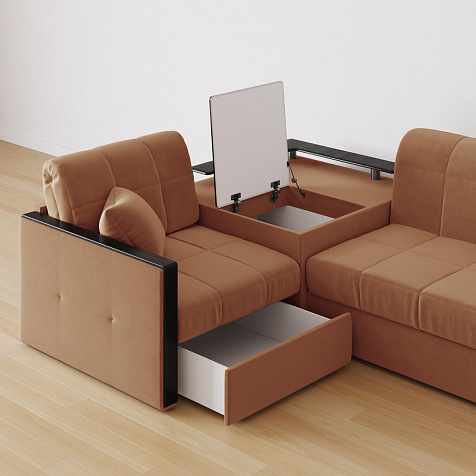 Вместительная система хранения. Под баром расположен вместительный короб, а в угловом модуле — глубокий ящик. В них удобно хранить одеяла, подушки, пледы и постельное белье.