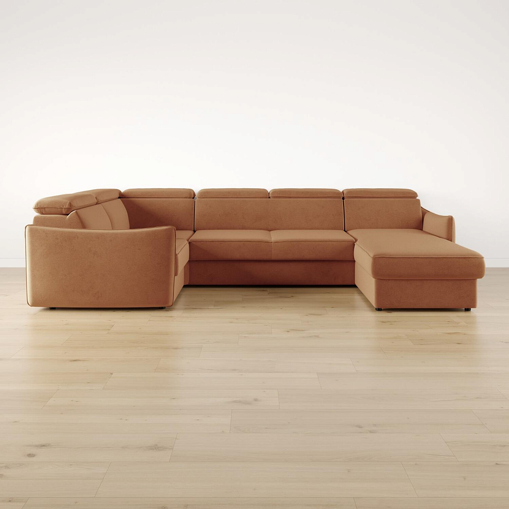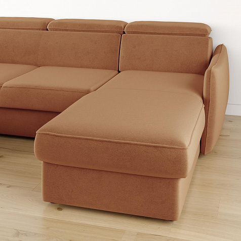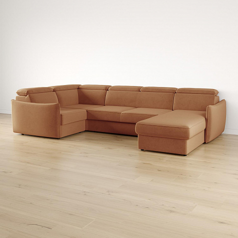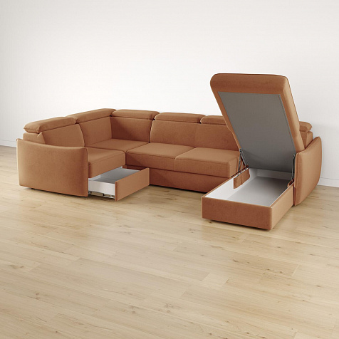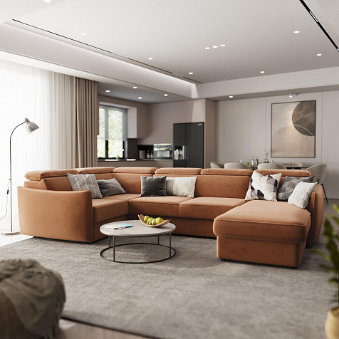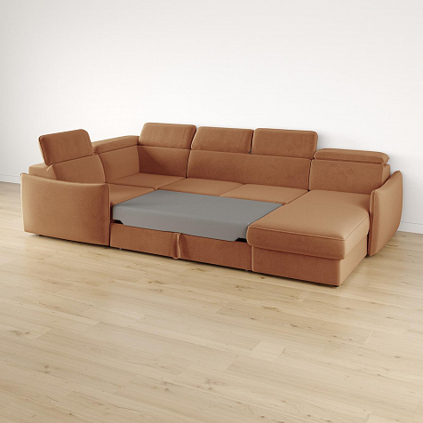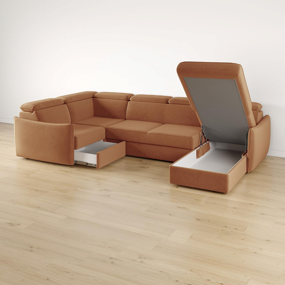 Широкий П-образный диван «Торонто» — идеальное решение для просторной гостиной и большой семьи. Благодаря своим габаритам модель подойдет для семейного просмотра фильмов и встречи гостей. Механизм трансформации «Дельфин» обеспечивает ровное спальное место, что идеально подходит для ежедневного сна. Регулируемые подголовники имеют шесть положений, поэтому можно подобрать подходящее положение и с комфортном расслабиться после рабочего дня. В кресельной части установлен ящик для хранения постельного белья и других вещей. Аккуратная отсрочка на подлокотниках и подголовниках завершают строгий образ модели.