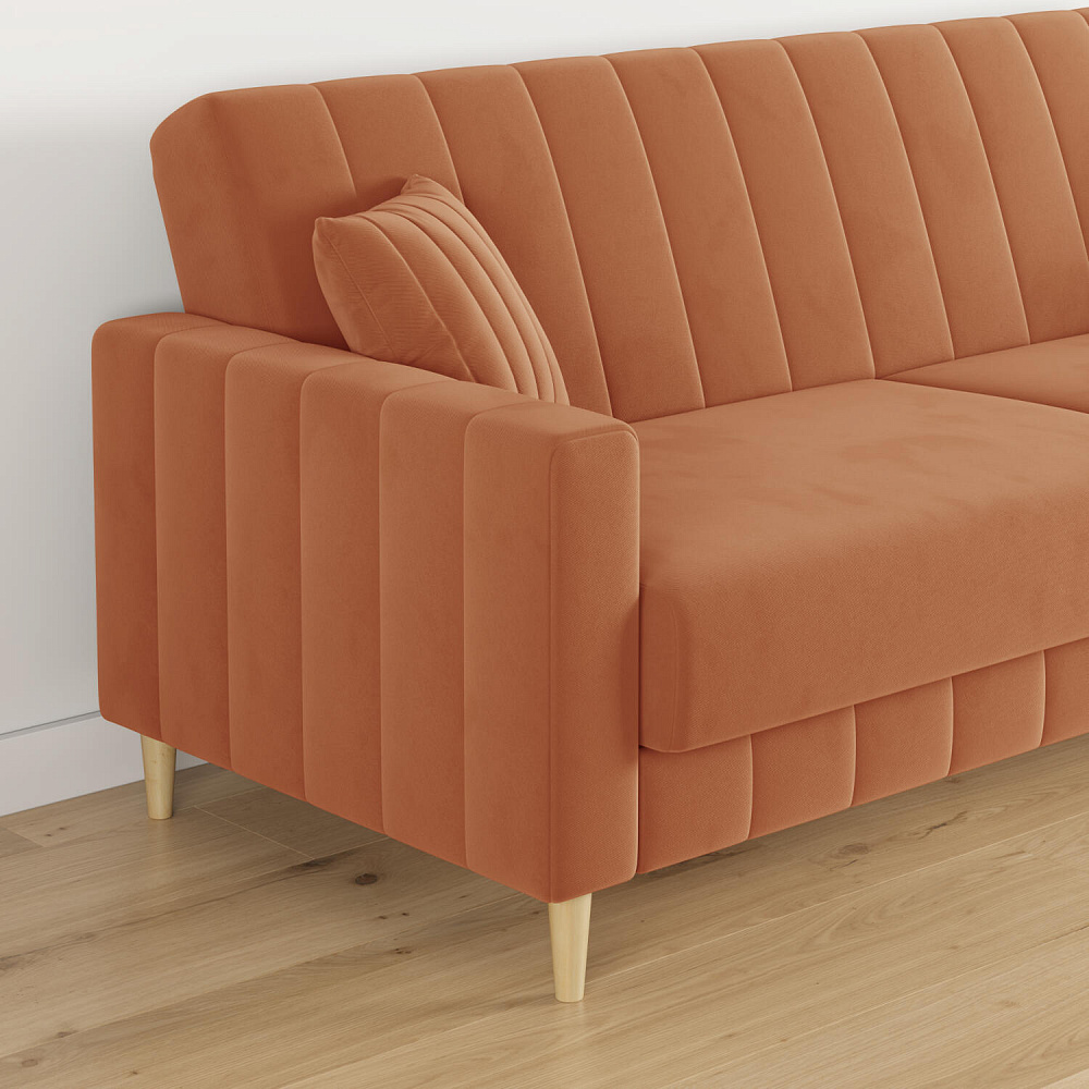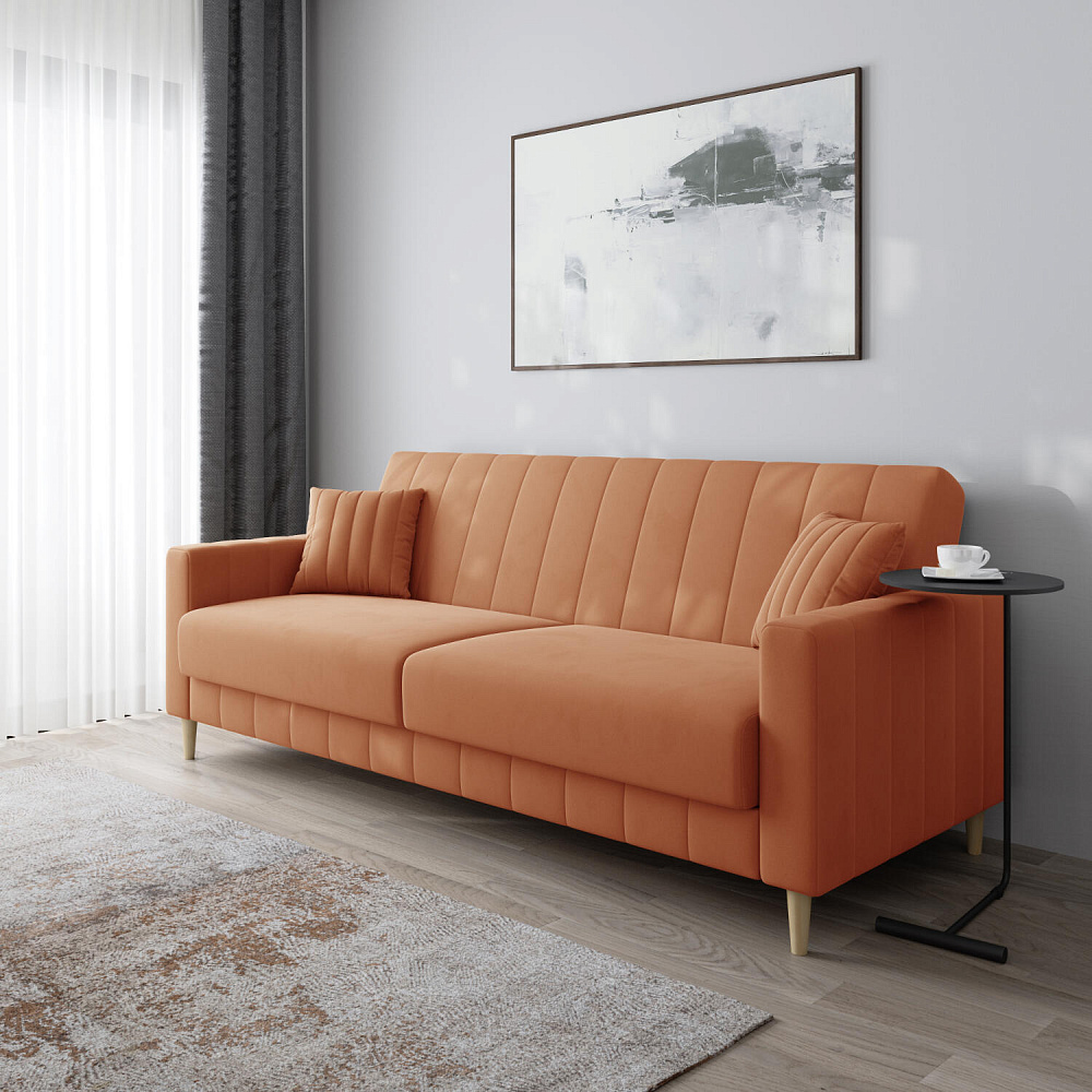 Диван «Бронкс» дополнит гостиную в современном или скандинавском стиле. Модель сочетает в себе минималистичный дизайн, спальное место и ящик для хранения. Задняя часть спинки выполнена в основной обивочной ткани, что дает возможность свободно размещать диван и зонировать комнату. Высокие опоры из натурального дерева создают легкий эффект невесомости и значительно облегчают процесс уборки.