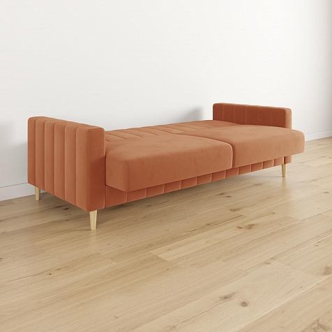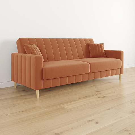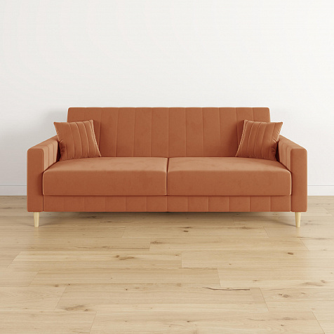 Механизм трансформации «Книжка». Чтобы разложить диван, нужно приподнять спинку и сиденье до щелчка и положить их вниз. Лучше ставить диван на расстоянии от стены, чтобы не двигать его при трансформации.
