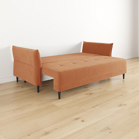 Механизм трансформации «Еврокнижка». Диван легко раскладывается — нужно выдвинуть вперед сиденье и опустить спинку. Удобен механизм ещё тем, что двигается только передняя часть, поэтому отодвигать диван от стены не требуется.