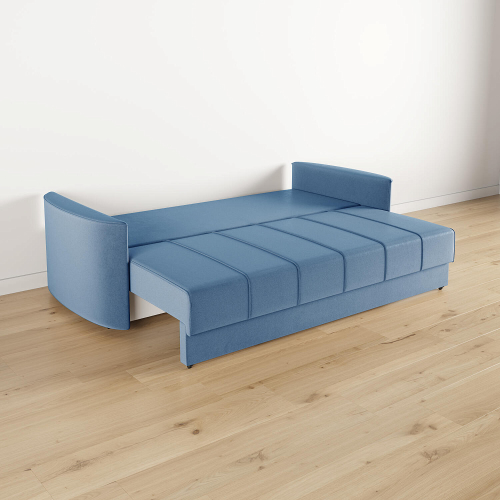 - Механизм трансформации «Еврокнижка». Диван легко раскладывается — достаточно выкатить вперёд сиденье и опустить спинку. Отодвигать диван от стены не требуется.