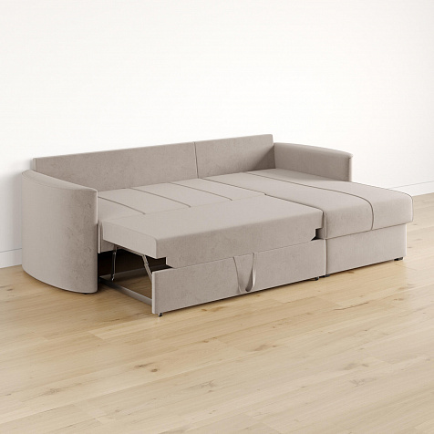 - Механизм трансформации «Дельфин». Диван легко раскладывается — достаточно выдвинуть раму с дополнительным спальным местом из-под более широкой части дивана и потянуть вверх и вперёд за специальную петлю.