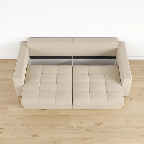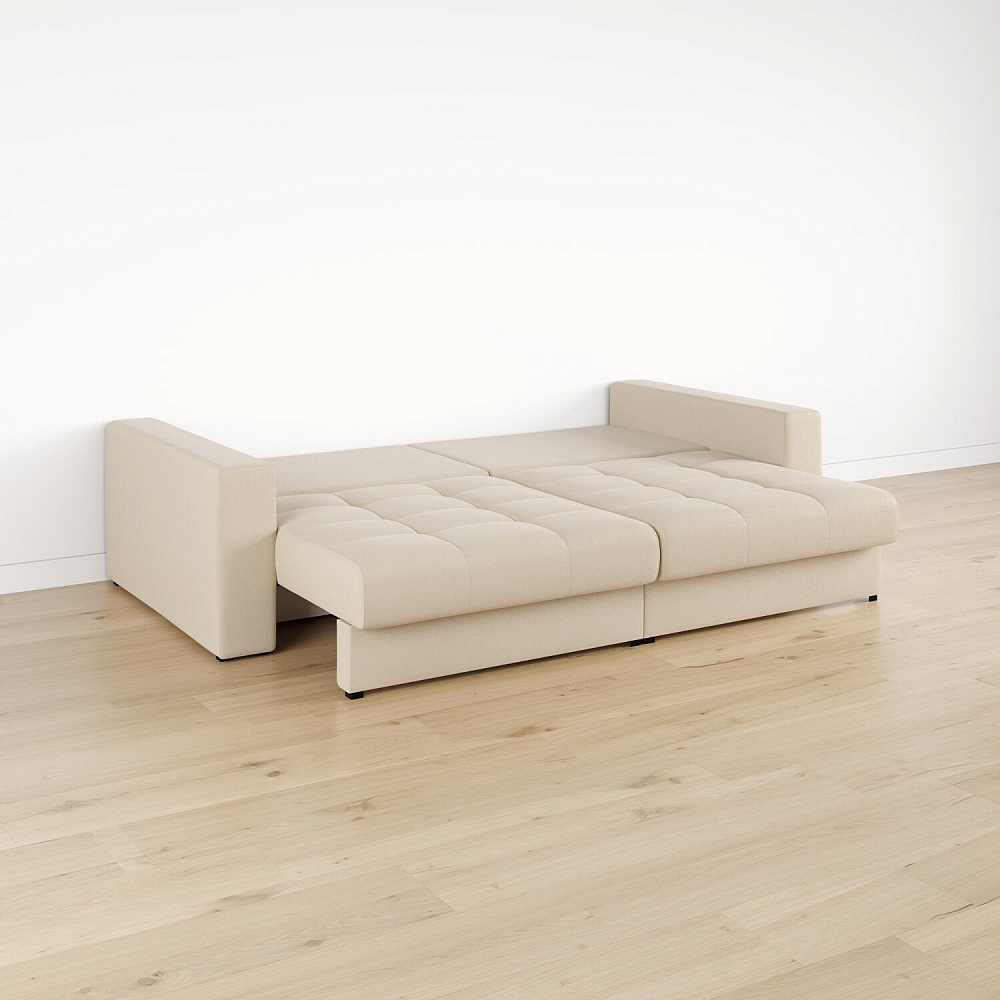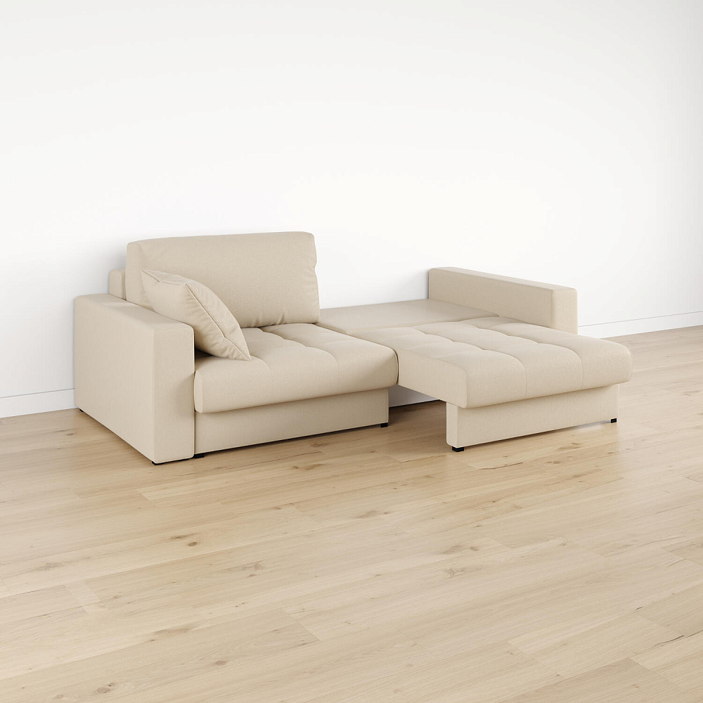 Бережный механизм трансформации «Тик-Так» двухсекционный. Сиденье выталкивается вверх, словно шагает вперед, и плавно опускается вниз без вреда для напольного покрытия. Половинки дивана раскладываются независимо друг от друга.