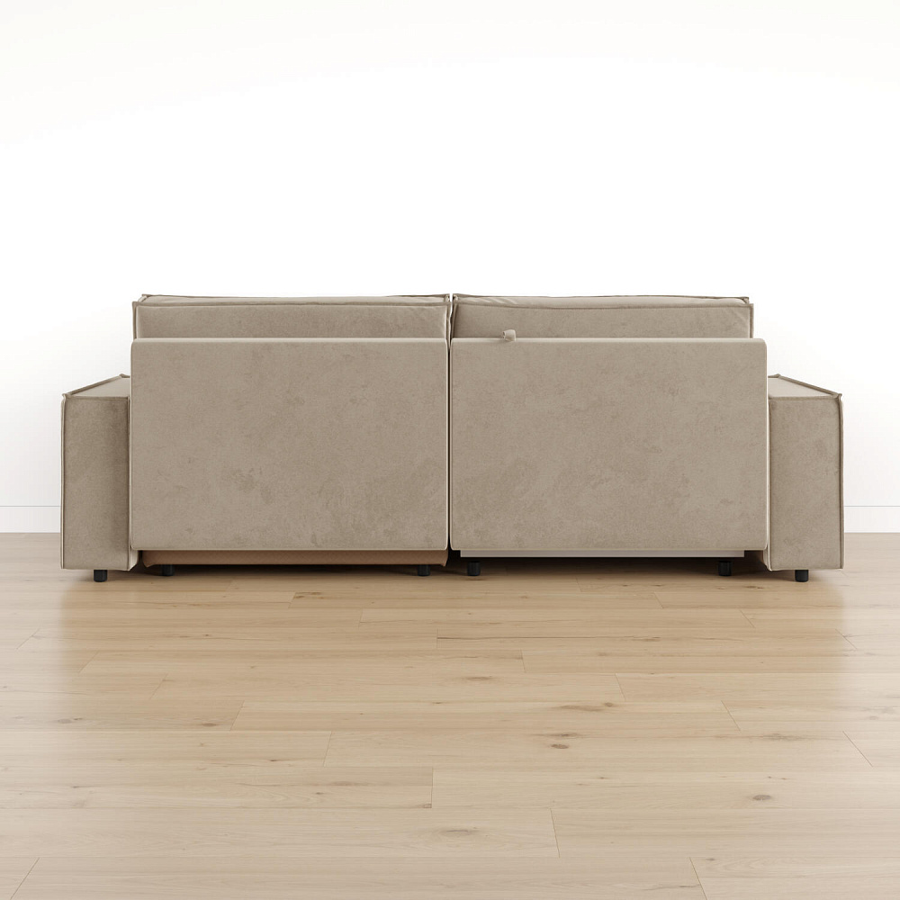Обратная сторона спинки в обивочной ткани. Диван прекрасно подойдёт для зонирования помещений или расположения в центре комнаты.