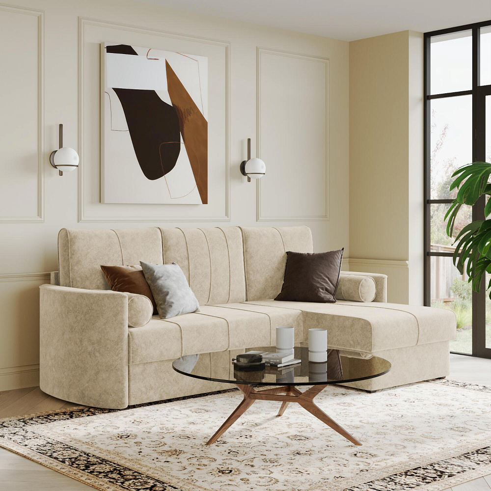 Угловой диван «Амми» — это идеальное сочетание надёжности, простоты и комфорта. Прямая строчка на сиденье и приспинных подушках создает завершённый образ и придает модели мягкую геометричность. Механизм «Дельфин» в сложенном виде поможет сэкономить пространство в комнате и использовать диван для ежедневного сна. Благодаря универсальному дизайну, качественным материалам и эргономичности диван станет главным местом гостиной в современном стиле, сканди или лофт.