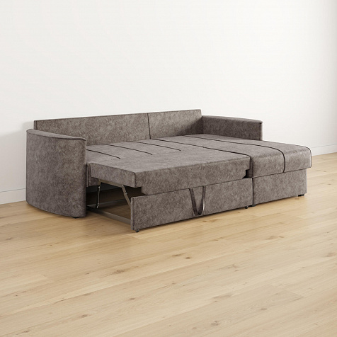 - Механизм трансформации «Дельфин». Диван легко раскладывается — достаточно выдвинуть раму с дополнительным спальным местом из-под более широкой части дивана и потянуть вверх и вперёд за специальную петлю.