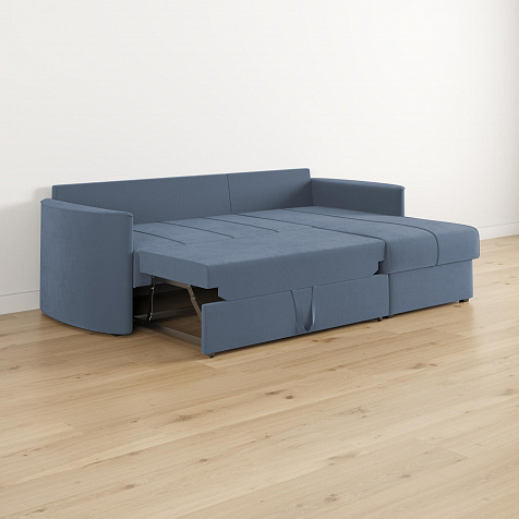 - Механизм трансформации «Дельфин». Диван легко раскладывается — достаточно выдвинуть раму с дополнительным спальным местом из-под более широкой части дивана и потянуть вверх и вперёд за специальную петлю.