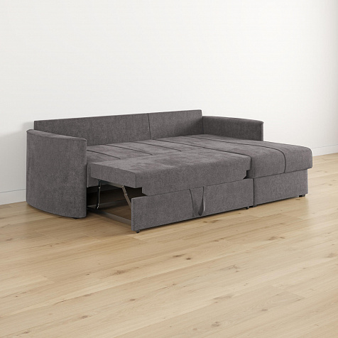 - Механизм трансформации «Дельфин». Диван легко раскладывается — достаточно выдвинуть раму с дополнительным спальным местом из-под более широкой части дивана и потянуть вверх и вперёд за специальную петлю.