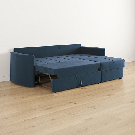 - Механизм трансформации «Дельфин». Диван легко раскладывается — достаточно выдвинуть раму с дополнительным спальным местом из-под более широкой части дивана и потянуть вверх и вперёд за специальную петлю.