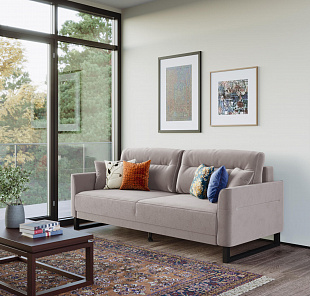 - Механизм трансформации «Дельфин». Диван легко раскладывается — нужно выкатить вперёд и приподнять нижнюю часть сиденья, при этом отодвигать сам диван от стены не требуется.