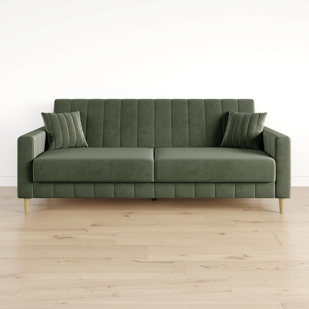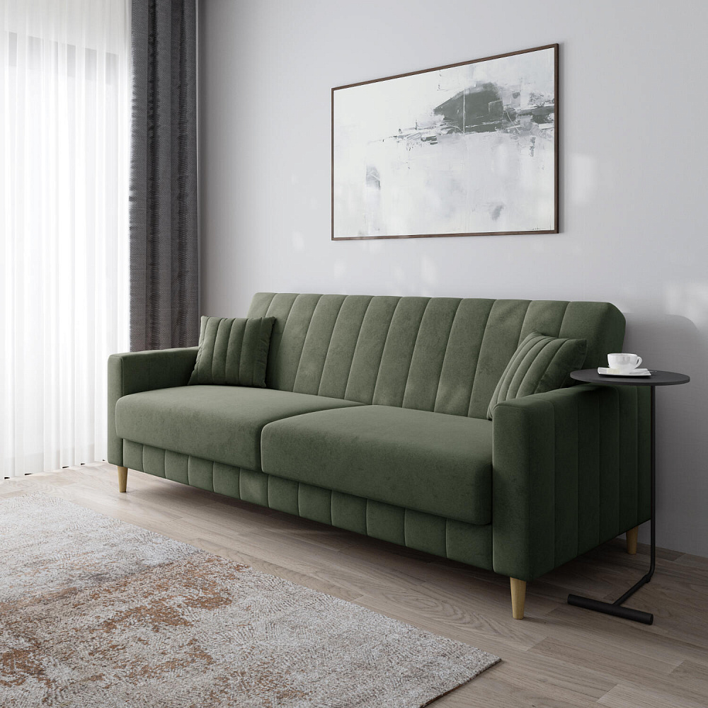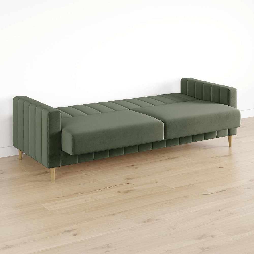 Диван-книжка «Бронкс» украсит гостиную в современном или скандинавском стиле. Модель предлагает уютный дизайн с прямыми формами, спальное место и ящик для хранения. Задняя часть спинки выполнена в основной обивочной ткани, что дает возможность свободно размещать диван и зонировать пространство комнаты. Высокие опоры из натурального дерева создают легкий эффект невесомости и облегчают процесс уборки.