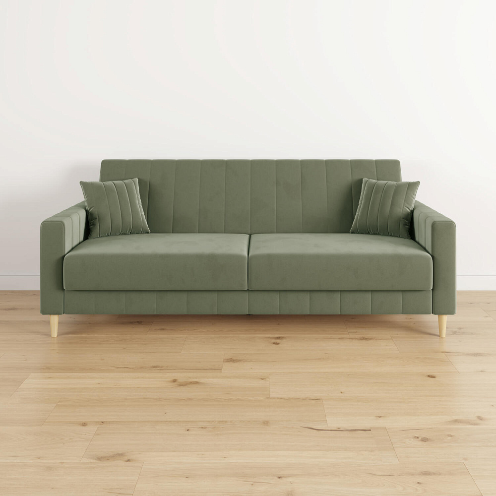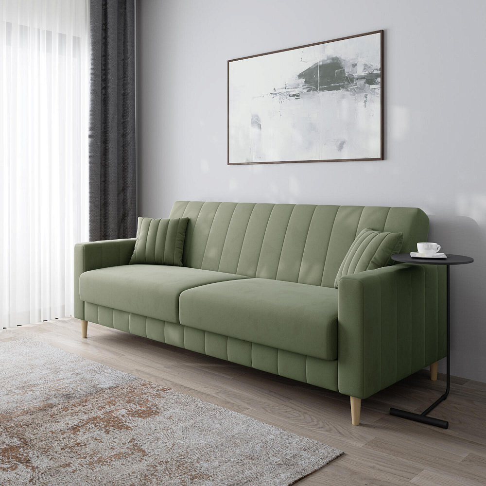 Механизм трансформации «Книжка». Чтобы разложить диван, нужно приподнять спинку и сиденье до щелчка и положить их вниз. Лучше ставить диван на расстоянии от стены, чтобы не двигать его при трансформации.