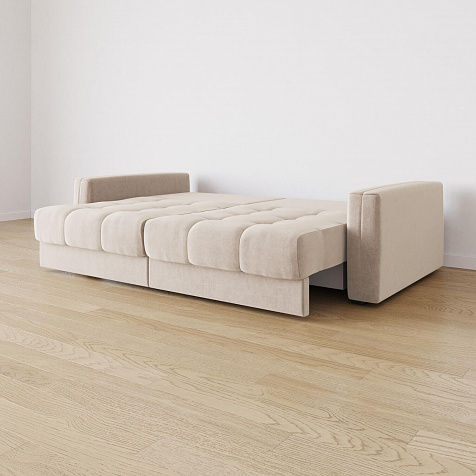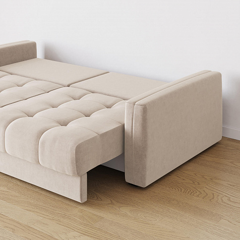 - Бережный механизм трансформации «Тик-Так» двухсекционный. Напольное покрытие останется целым - механизм выталкивает сиденье вверх, которое словно шагает вперёд, не касаясь пола. Трансформация лёгкая - справится даже ребёнок. Половинки дивана раскладываются независимо друг от друга.