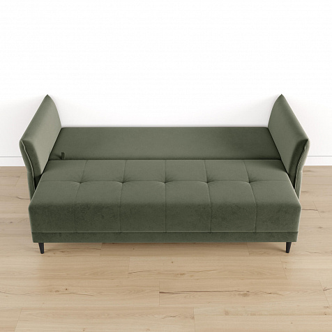 Механизм трансформации «Еврокнижка». Диван легко раскладывается — нужно выдвинуть вперед сиденье и опустить спинку. Удобен механизм ещё тем, что двигается только передняя часть, поэтому отодвигать диван от стены не требуется.