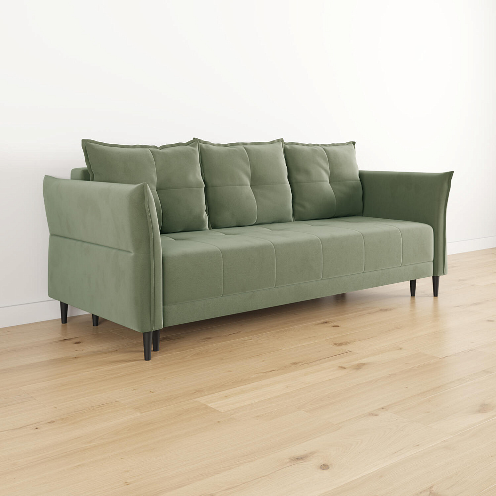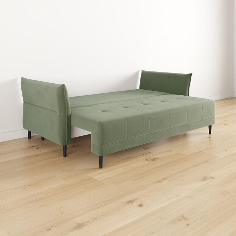 Механизм трансформации «Еврокнижка». Диван легко раскладывается — нужно выдвинуть вперед сиденье и опустить спинку. Удобен механизм ещё тем, что двигается только передняя часть, поэтому отодвигать диван от стены не требуется.
