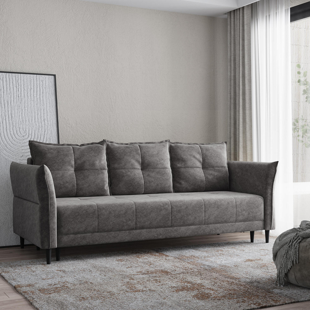 Механизм трансформации «Еврокнижка». Диван легко раскладывается — нужно выдвинуть вперед сиденье и опустить спинку. Удобен механизм ещё тем, что двигается только передняя часть, поэтому отодвигать диван от стены не требуется.