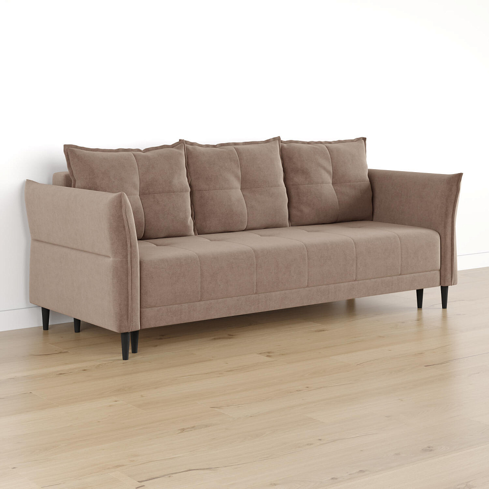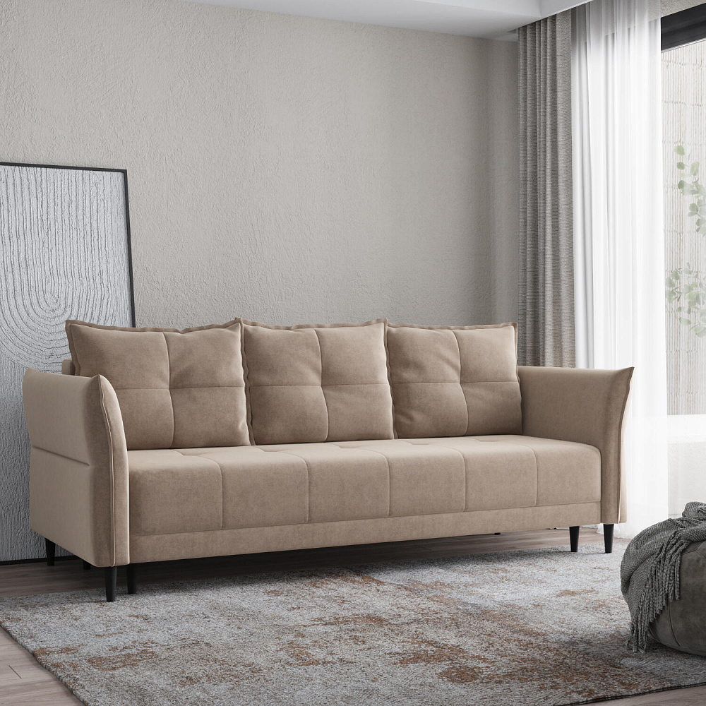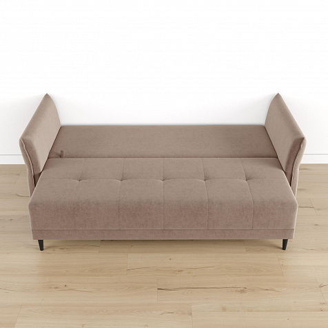 Механизм трансформации «Еврокнижка». Диван легко раскладывается — нужно выдвинуть вперед сиденье и опустить спинку. Удобен механизм ещё тем, что двигается только передняя часть, поэтому отодвигать диван от стены не требуется.