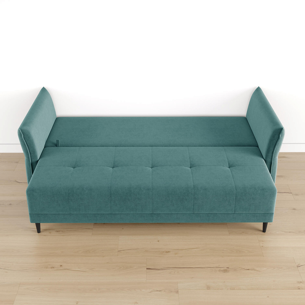 Механизм трансформации «Еврокнижка». Диван легко раскладывается — нужно выдвинуть вперед сиденье и опустить спинку. Удобен механизм ещё тем, что двигается только передняя часть, поэтому отодвигать диван от стены не требуется.