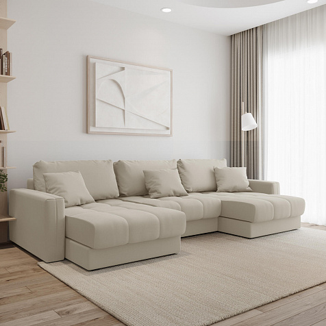 П-образный угловой диван «Дензел» — лучший вариант для ценителей комфорта и удобства в сочетании со стильным дизайном. Диван обладает глубокой посадкой, а приспинные и декоративные подушки позволят создать удобное место для отдыха. Угловая модель с двумя оттоманками займёт своё идеальное место в пространстве комнаты или студии. Спинка модели выполнена в обивочной ткани, что даёт возможность использовать диван для зонирования комнаты.