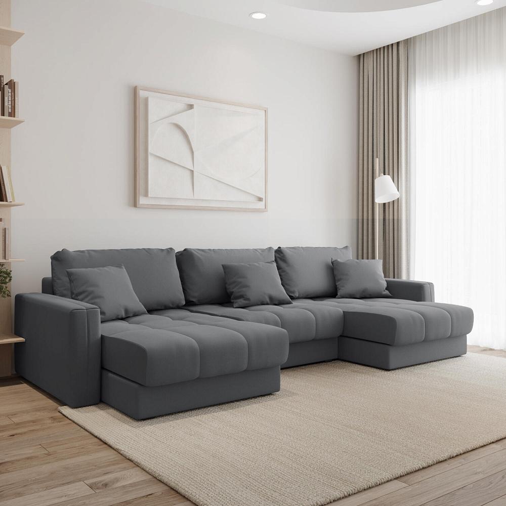 П-образный угловой диван «Дензел» — лучший вариант для ценителей комфорта и удобства в сочетании со стильным дизайном. Диван обладает глубокой посадкой, а приспинные и декоративные подушки позволят создать удобное место для отдыха. Угловая модель с двумя оттоманками займёт своё идеальное место в пространстве комнаты или студии. Спинка модели выполнена в обивочной ткани, что даёт возможность использовать диван для зонирования комнаты.