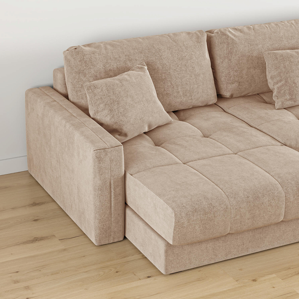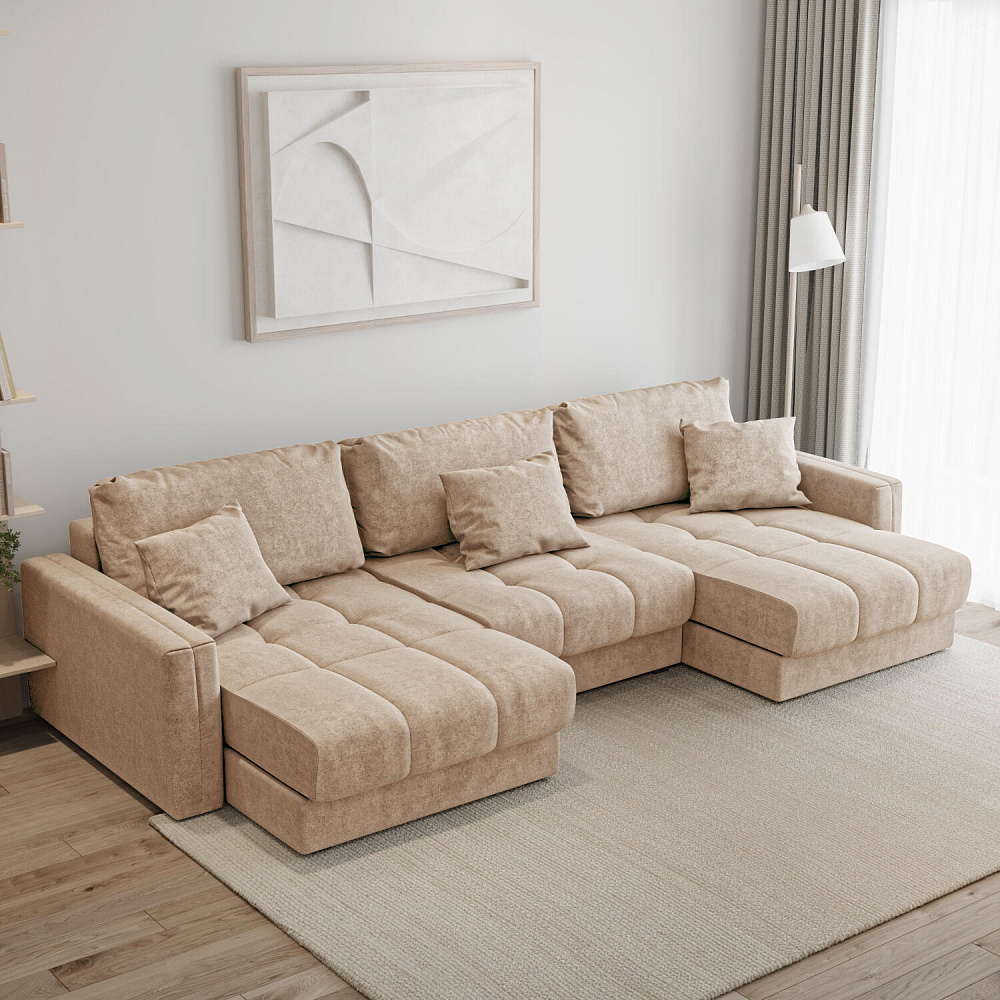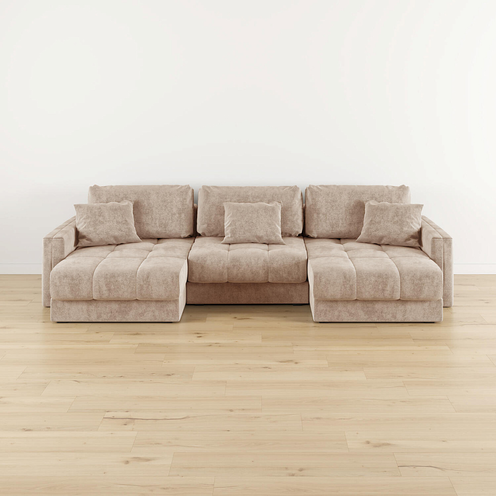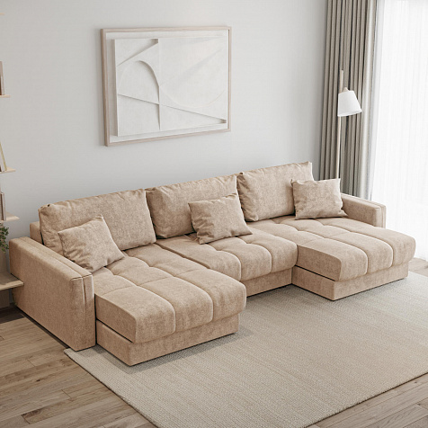 П-образный угловой диван «Дензел» — лучший вариант для ценителей комфорта и удобства в сочетании со стильным дизайном. Диван обладает глубокой посадкой, а приспинные и декоративные подушки позволят создать удобное место для отдыха. Угловая модель с двумя оттоманками займёт своё идеальное место в пространстве комнаты или студии. Спинка модели выполнена в обивочной ткани, что даёт возможность использовать диван для зонирования комнаты.