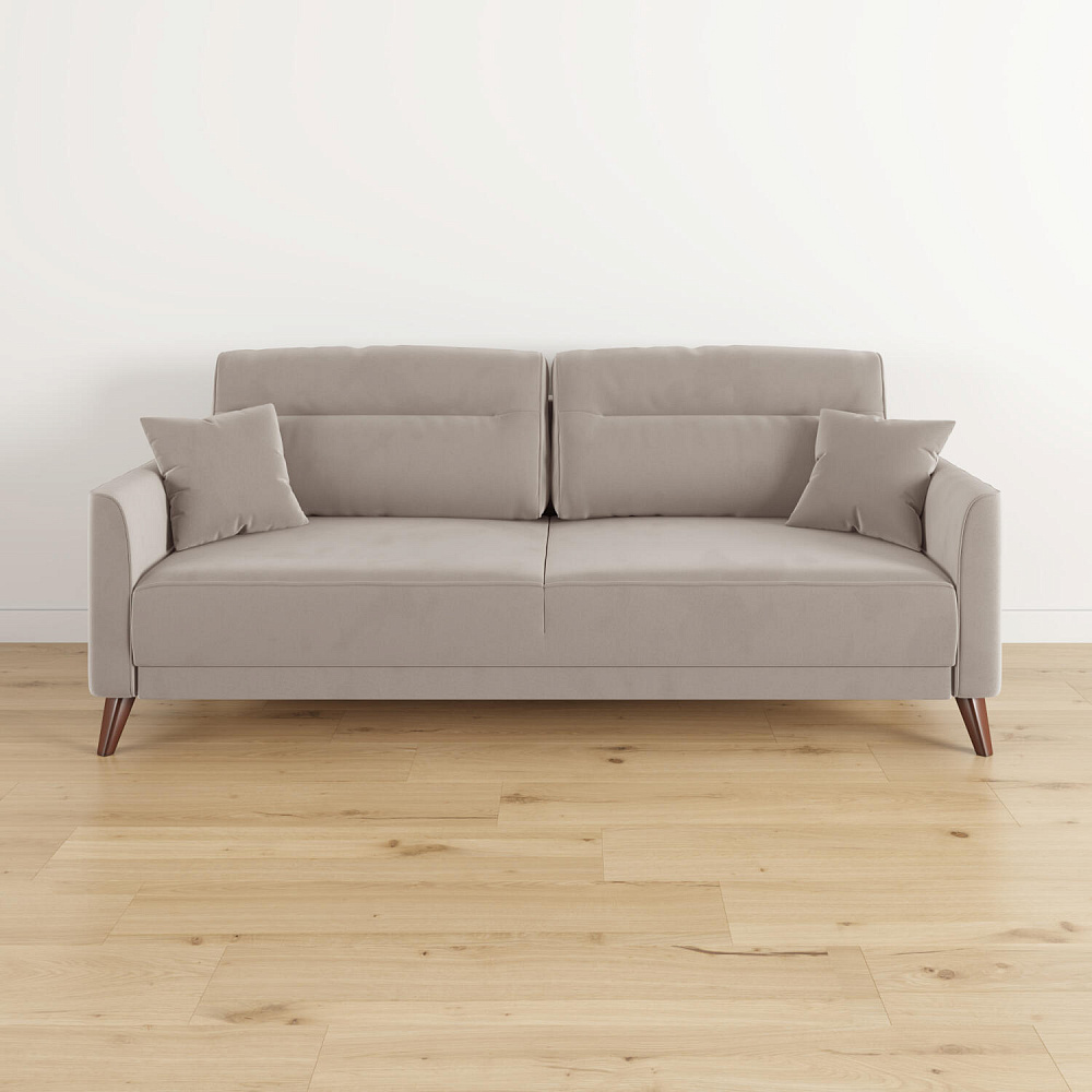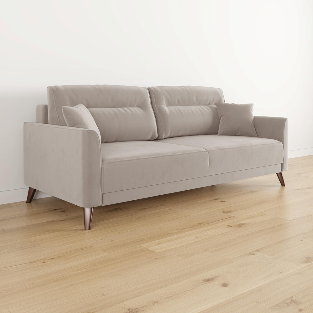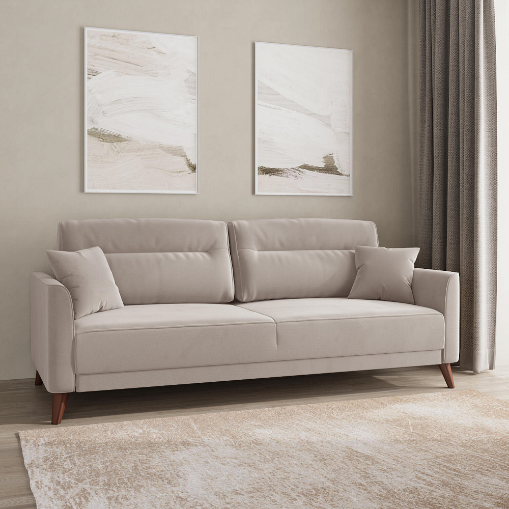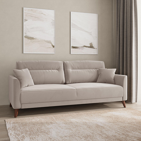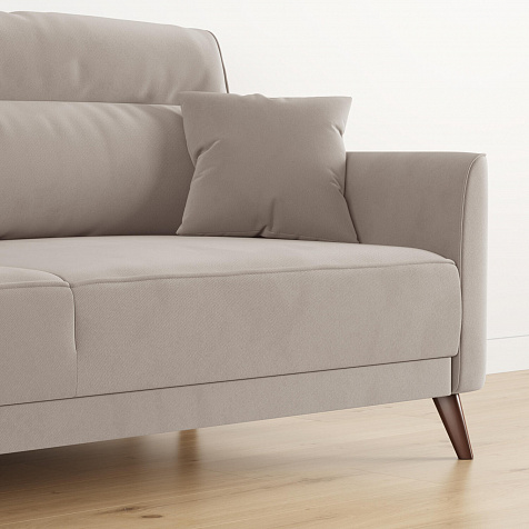 Диван «Монз» с глубокой посадкой оснащён механизмом трансформации и большим бельевым коробом. Дизайн отличается оригинальной строчкой на сиденье и приспинных подушках, декоративными подушками в комплекте и узкими подлокотниками. Высокие опоры визуально облегчают конструкцию дивана и открывают доступ к уборке пространства под ним.