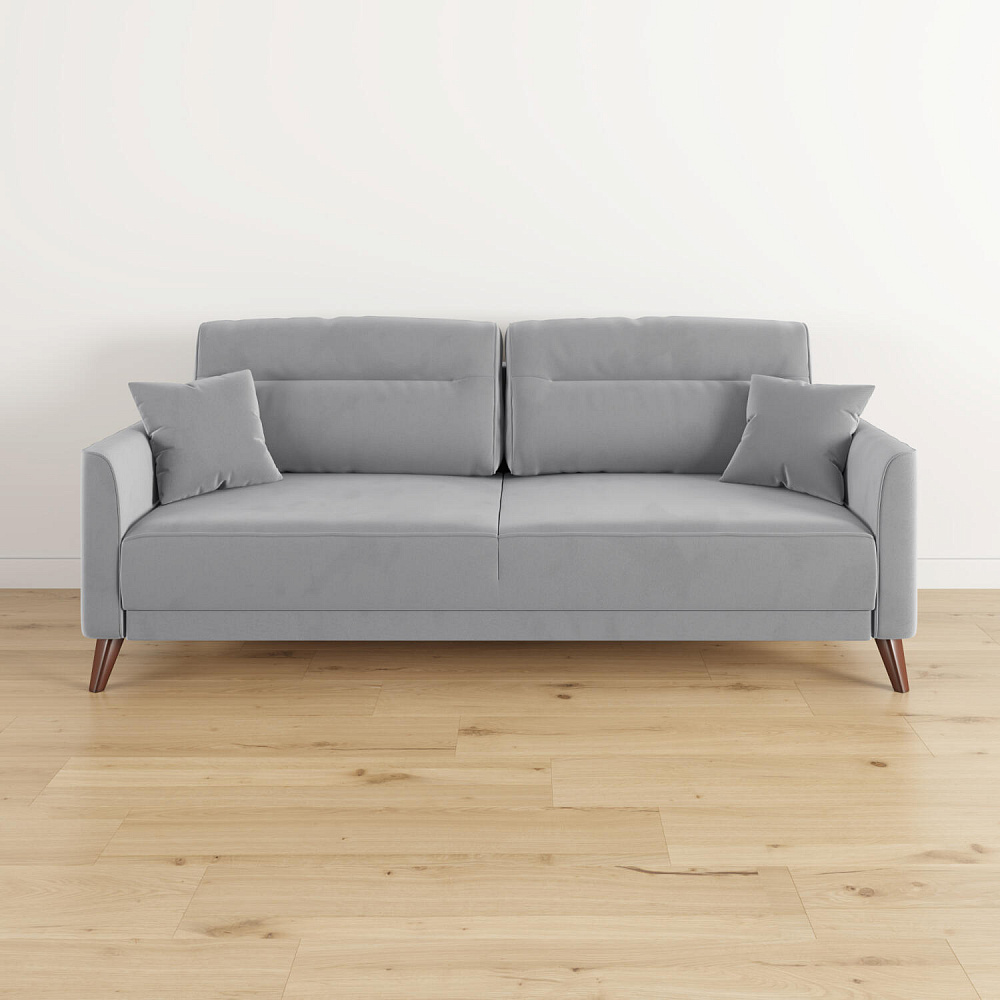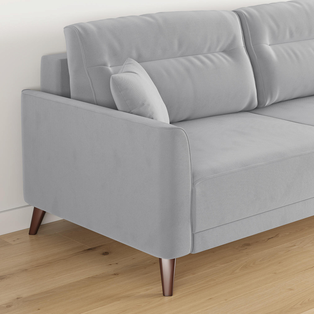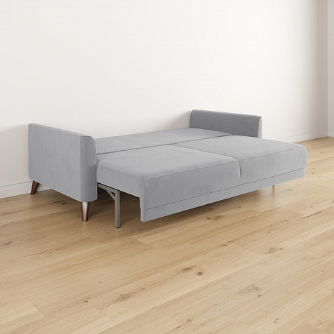 Диван «Монз» с глубокой посадкой оснащён механизмом трансформации и большим бельевым коробом. Дизайн отличается оригинальной строчкой на сиденье и приспинных подушках, декоративными подушками в комплекте и узкими подлокотниками. Высокие опоры визуально облегчают конструкцию дивана и открывают доступ к уборке пространства под ним.