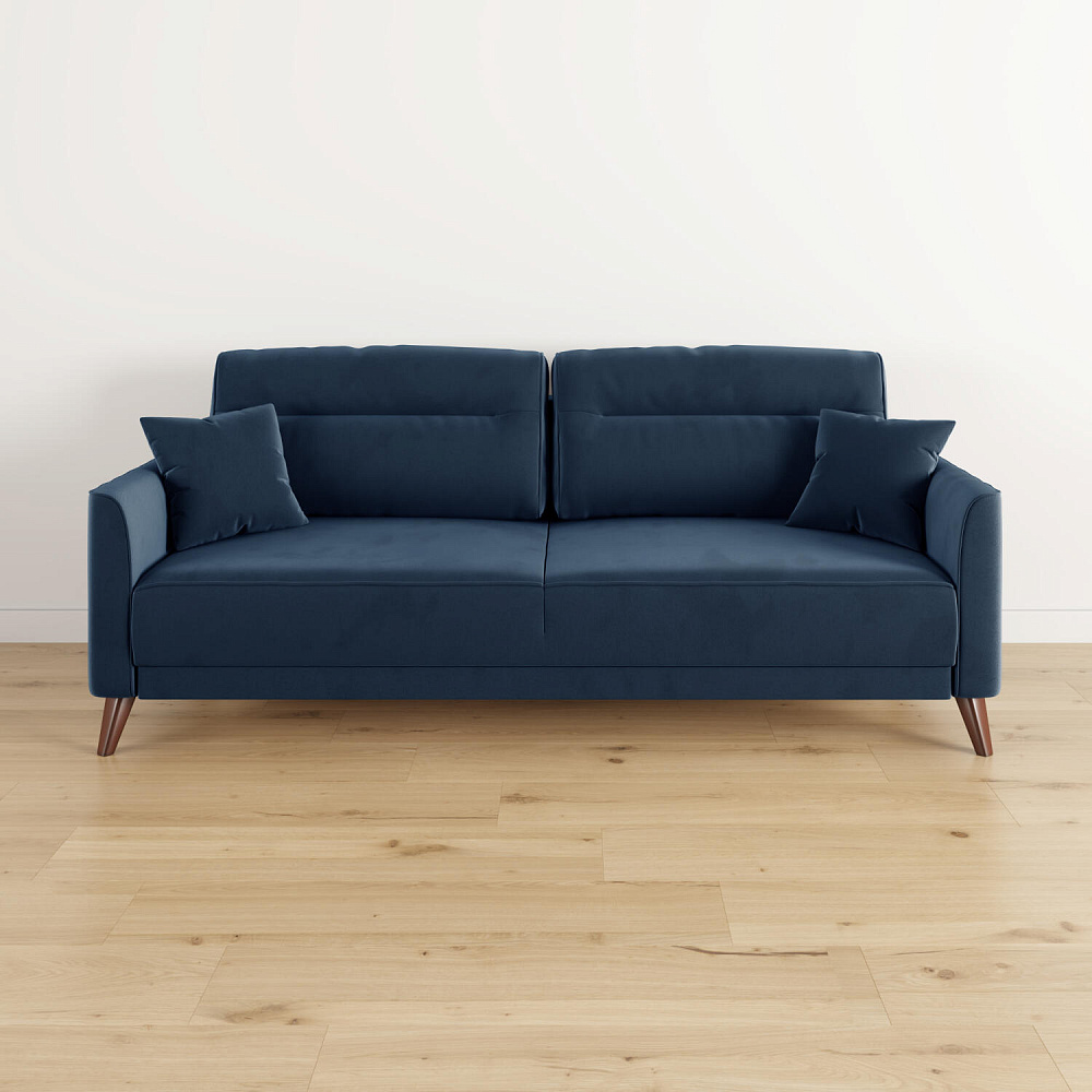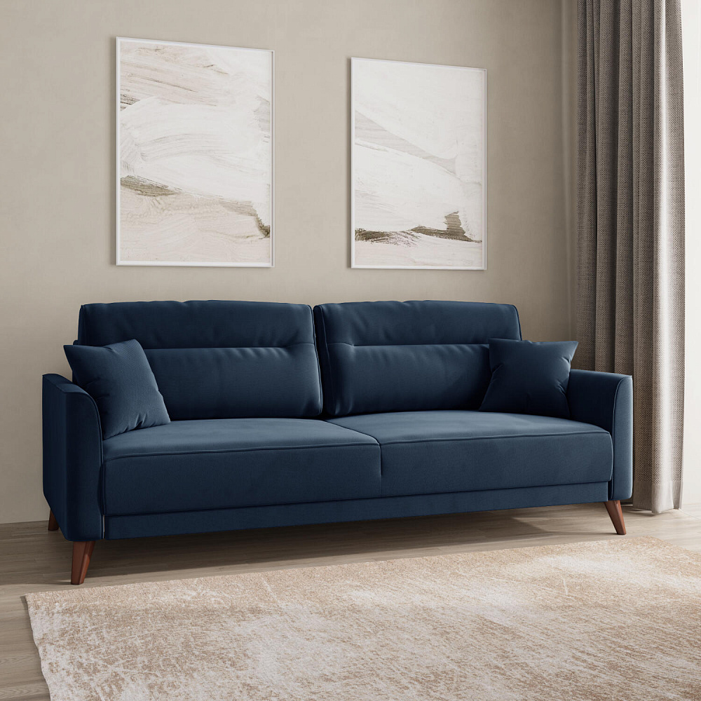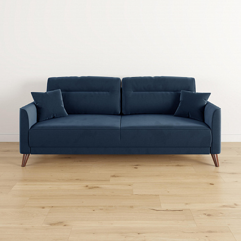 Диван «Монз» с глубокой посадкой оснащён механизмом трансформации и большим бельевым коробом. Дизайн отличается оригинальной строчкой на сиденье и приспинных подушках, декоративными подушками в комплекте и узкими подлокотниками. Высокие опоры визуально облегчают конструкцию дивана и открывают доступ к уборке пространства под ним.