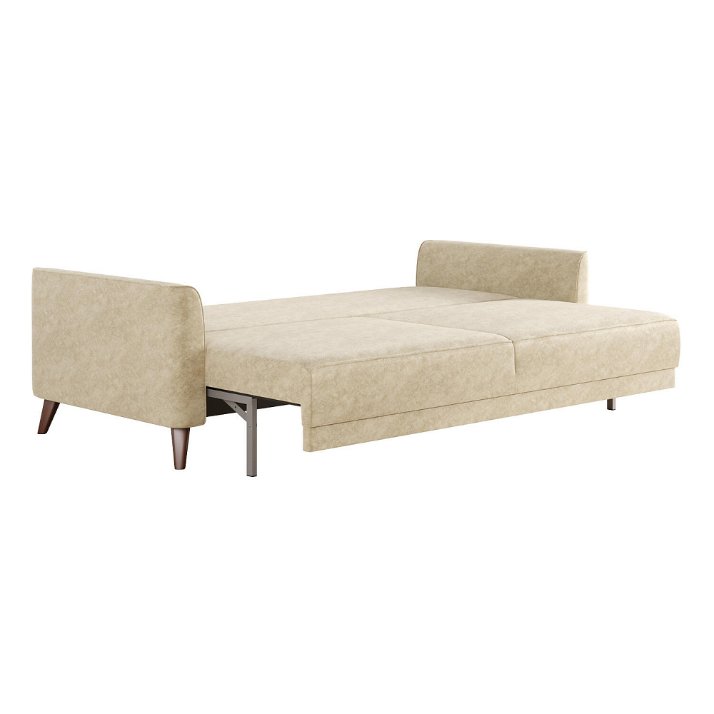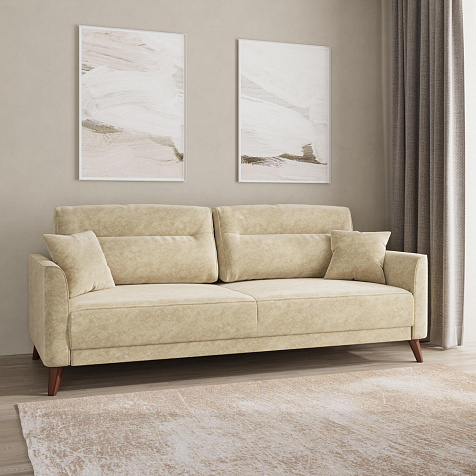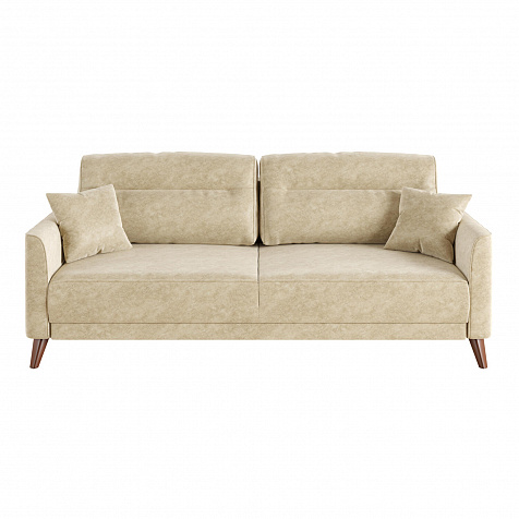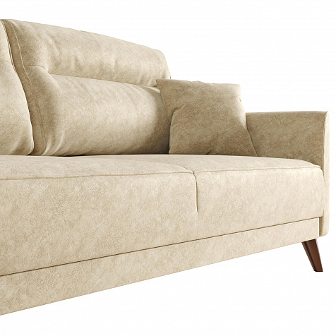 Диван «Монз» с глубокой посадкой оснащён механизмом трансформации и большим бельевым коробом. Дизайн отличается оригинальной строчкой на сиденье и приспинных подушках, декоративными подушками в комплекте и узкими подлокотниками. Высокие опоры визуально облегчают конструкцию дивана и открывают доступ к уборке пространства под ним.