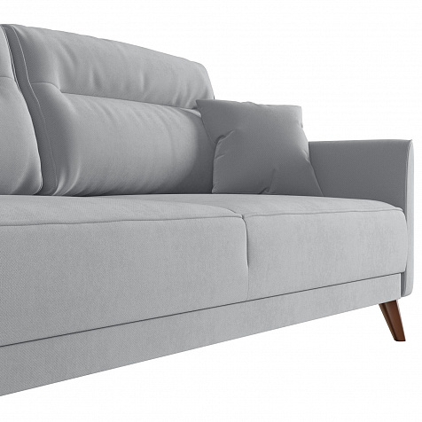Диван «Монз» с глубокой посадкой оснащён механизмом трансформации и большим бельевым коробом. Дизайн отличается оригинальной строчкой на сиденье и приспинных подушках, декоративными подушками в комплекте и узкими подлокотниками. Высокие опоры визуально облегчают конструкцию дивана и открывают доступ к уборке пространства под ним.