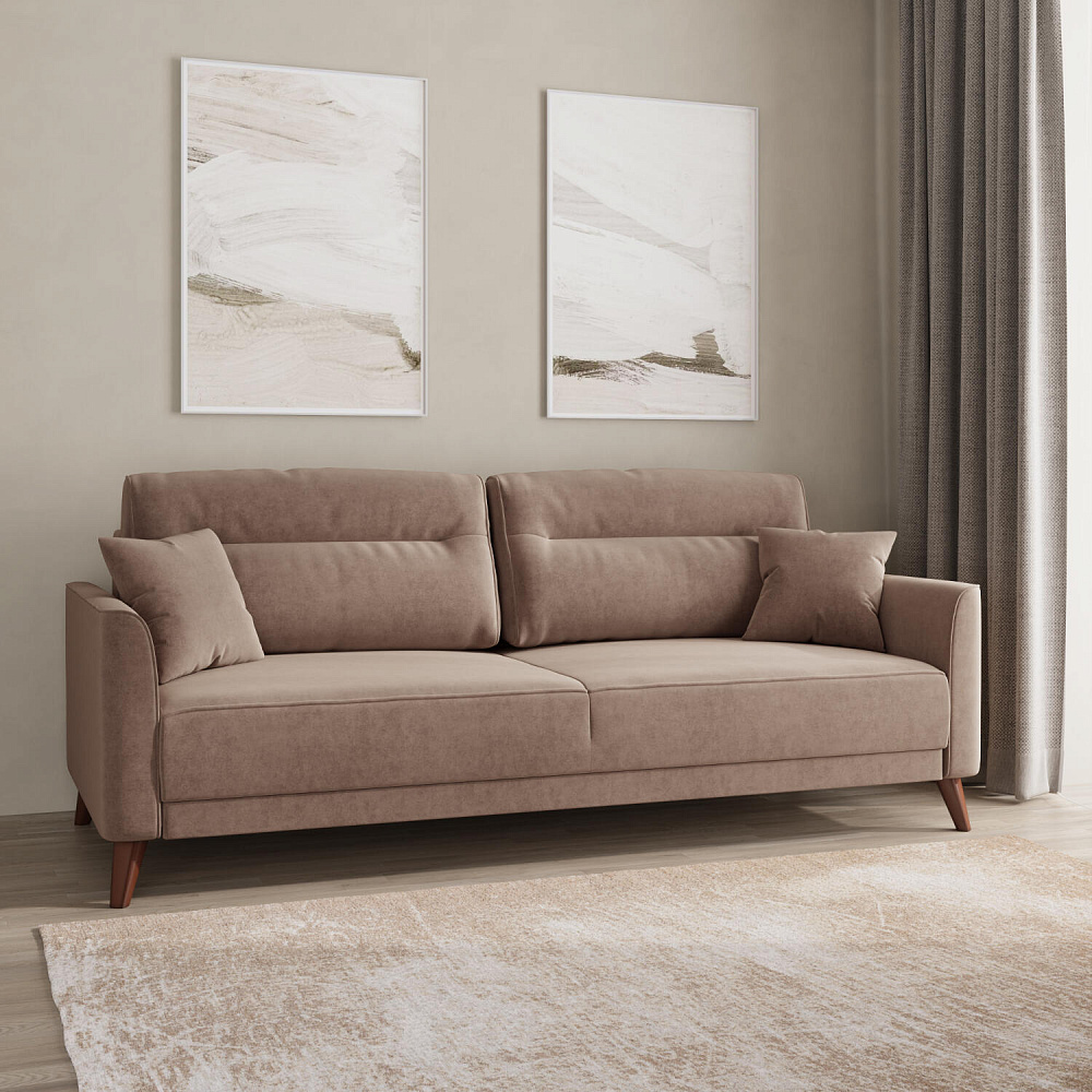 Диван «Монз» с глубокой посадкой оснащён механизмом трансформации и большим бельевым коробом. Дизайн отличается оригинальной строчкой на сиденье и приспинных подушках, декоративными подушками в комплекте и узкими подлокотниками. Высокие опоры визуально облегчают конструкцию дивана и открывают доступ к уборке пространства под ним.
