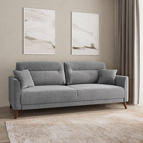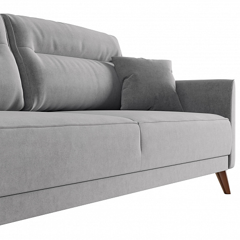 Диван «Монз» с глубокой посадкой оснащён механизмом трансформации и большим бельевым коробом. Дизайн отличается оригинальной строчкой на сиденье и приспинных подушках, декоративными подушками в комплекте и узкими подлокотниками. Высокие опоры визуально облегчают конструкцию дивана и открывают доступ к уборке пространства под ним.