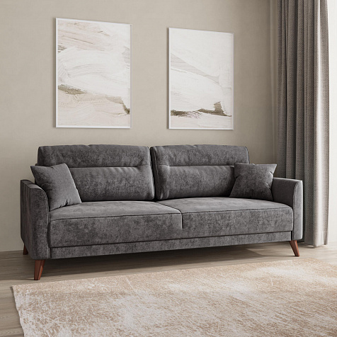 Диван «Монз» с глубокой посадкой оснащён механизмом трансформации и большим бельевым коробом. Дизайн отличается оригинальной строчкой на сиденье и приспинных подушках, декоративными подушками в комплекте и узкими подлокотниками. Высокие опоры визуально облегчают конструкцию дивана и открывают доступ к уборке пространства под ним.