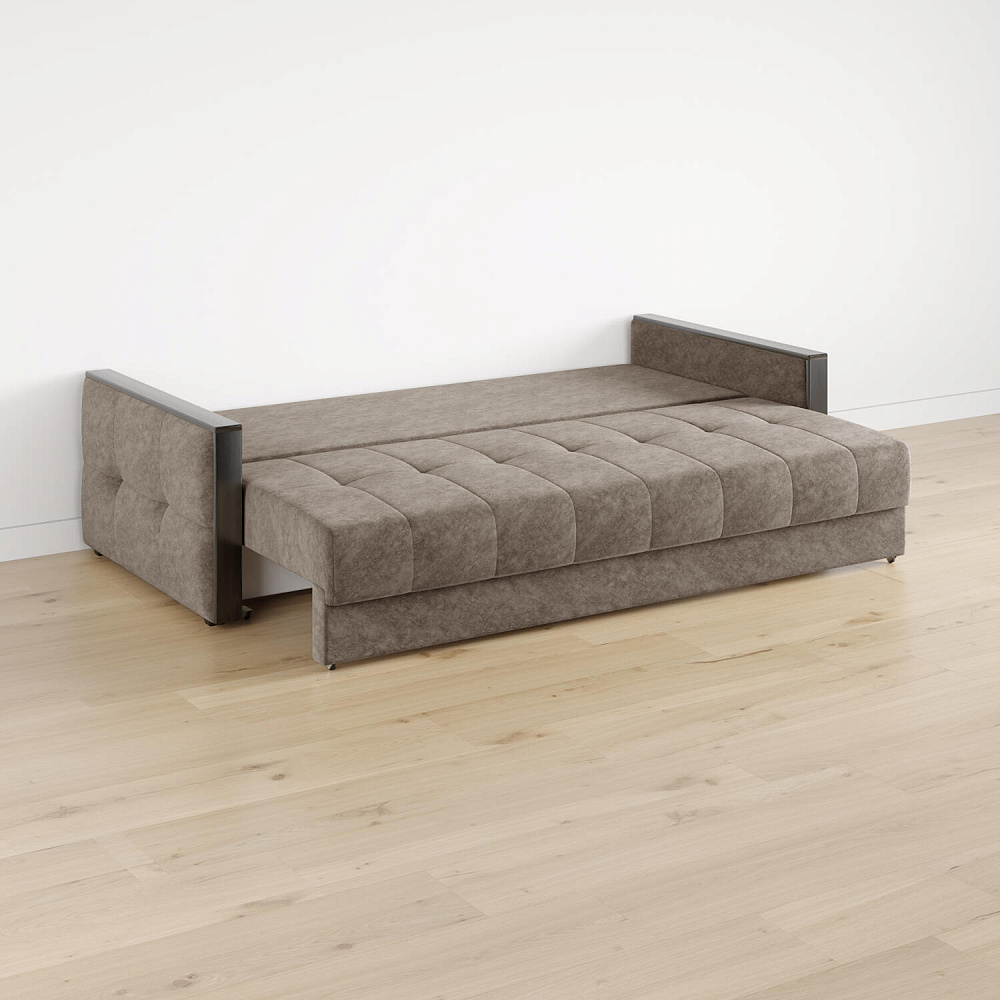 Механизм трансформации «Еврокнижка». Диван легко раскладывается — нужно выкатить вперёд сиденье и опустить спинку. Удобен механизм ещё тем, что двигается только передняя часть, поэтому отодвигать диван от стены не требуется.