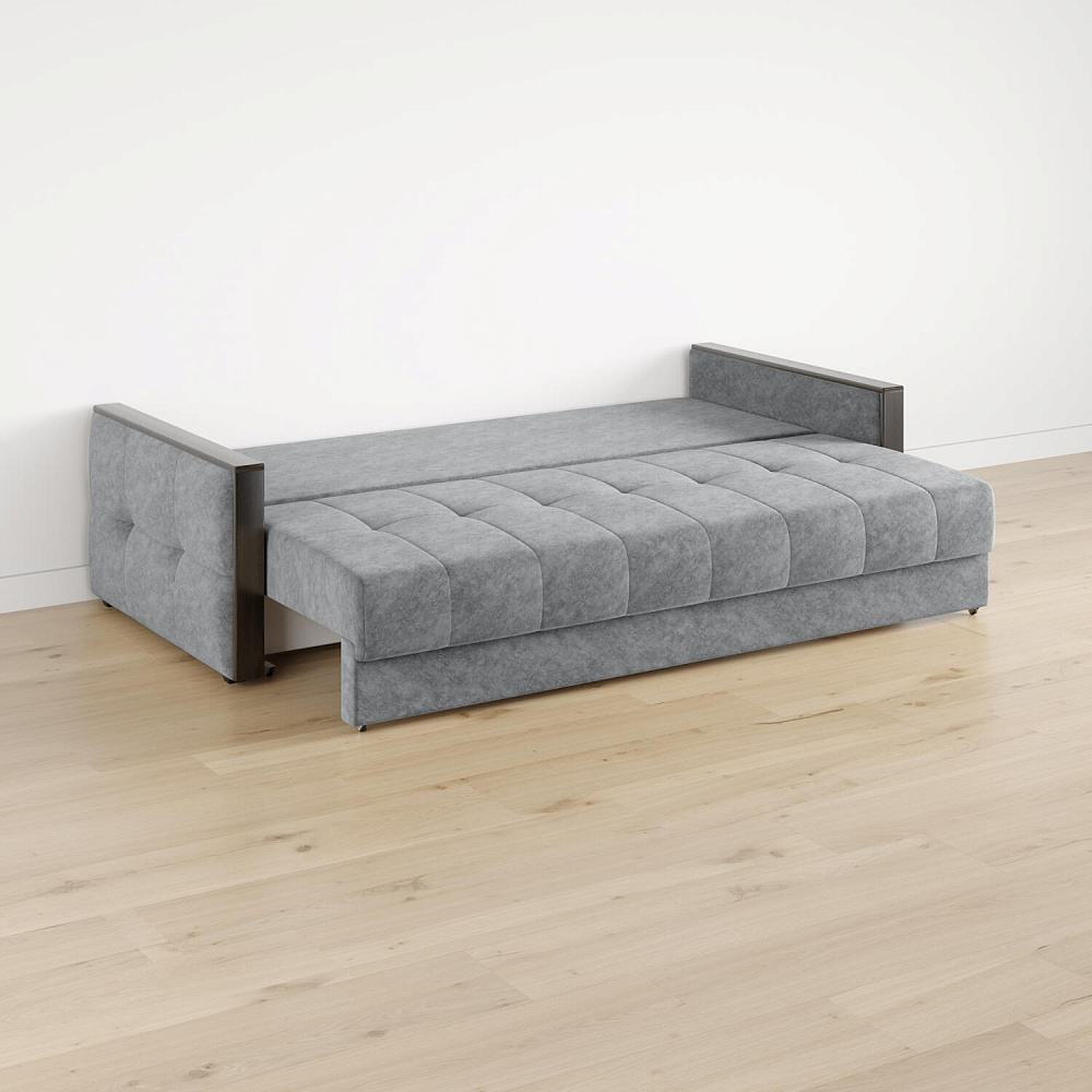 Механизм трансформации «Еврокнижка». Диван легко раскладывается — нужно выкатить вперёд сиденье и опустить спинку. Удобен механизм ещё тем, что двигается только передняя часть, поэтому отодвигать диван от стены не требуется.