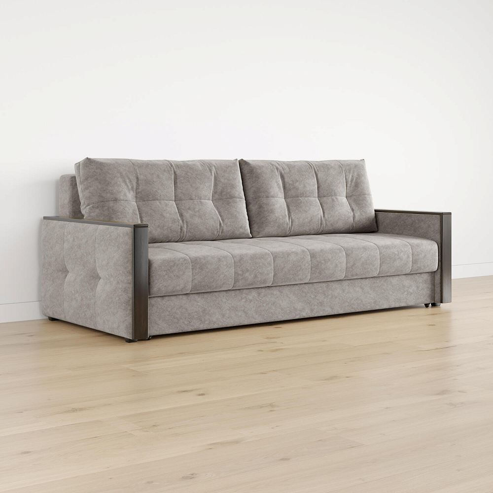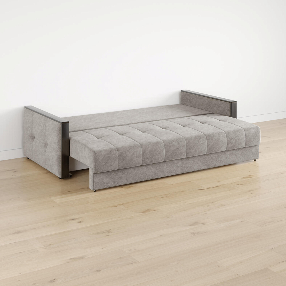 Механизм трансформации «Еврокнижка». Диван легко раскладывается — нужно выкатить вперёд сиденье и опустить спинку. Удобен механизм ещё тем, что двигается только передняя часть, поэтому отодвигать диван от стены не требуется.