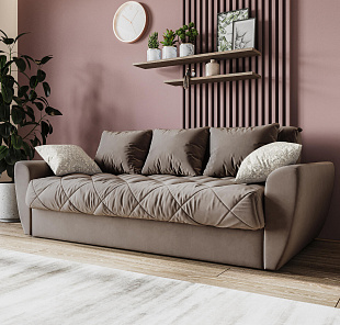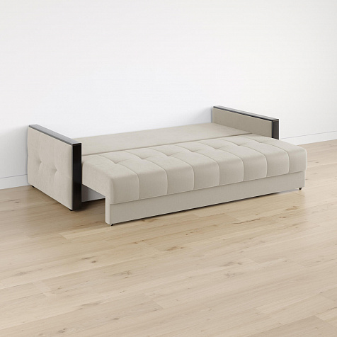 Механизм трансформации «Еврокнижка». Диван легко раскладывается — нужно выкатить вперёд сиденье и опустить спинку. Удобен механизм ещё тем, что двигается только передняя часть, поэтому отодвигать диван от стены не требуется.