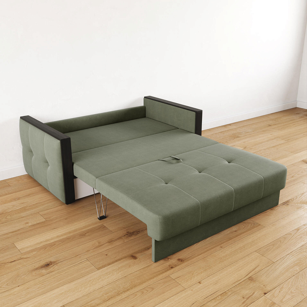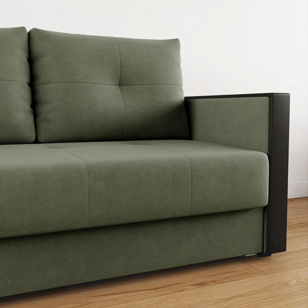 Механизм трансформации «Еврокнижка». Диван легко раскладывается: нужно выкатить вперёд сиденье и опустить спинку. Удобен механизм ещё тем, что двигается только передняя часть, поэтому отодвигать диван от стены не требуется.