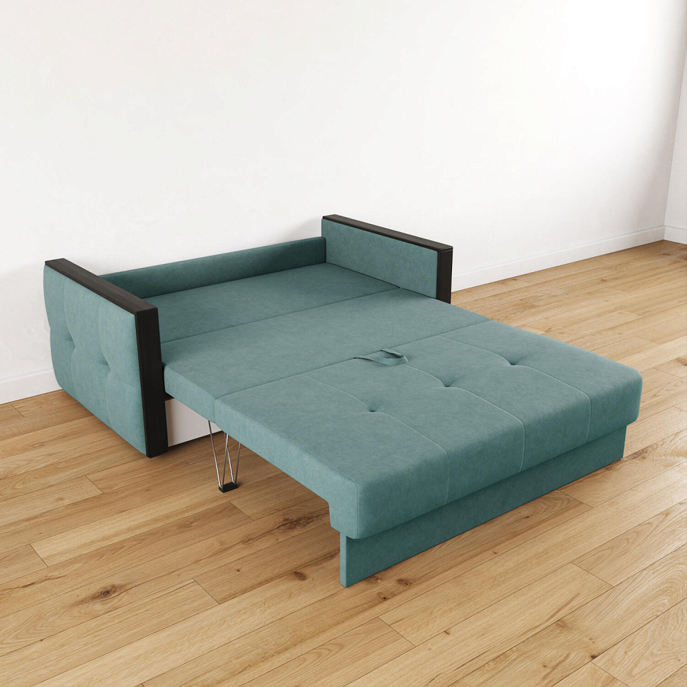 Механизм трансформации «Еврокнижка». Диван легко раскладывается: нужно выкатить вперёд сиденье и опустить спинку. Удобен механизм ещё тем, что двигается только передняя часть, поэтому отодвигать диван от стены не требуется.