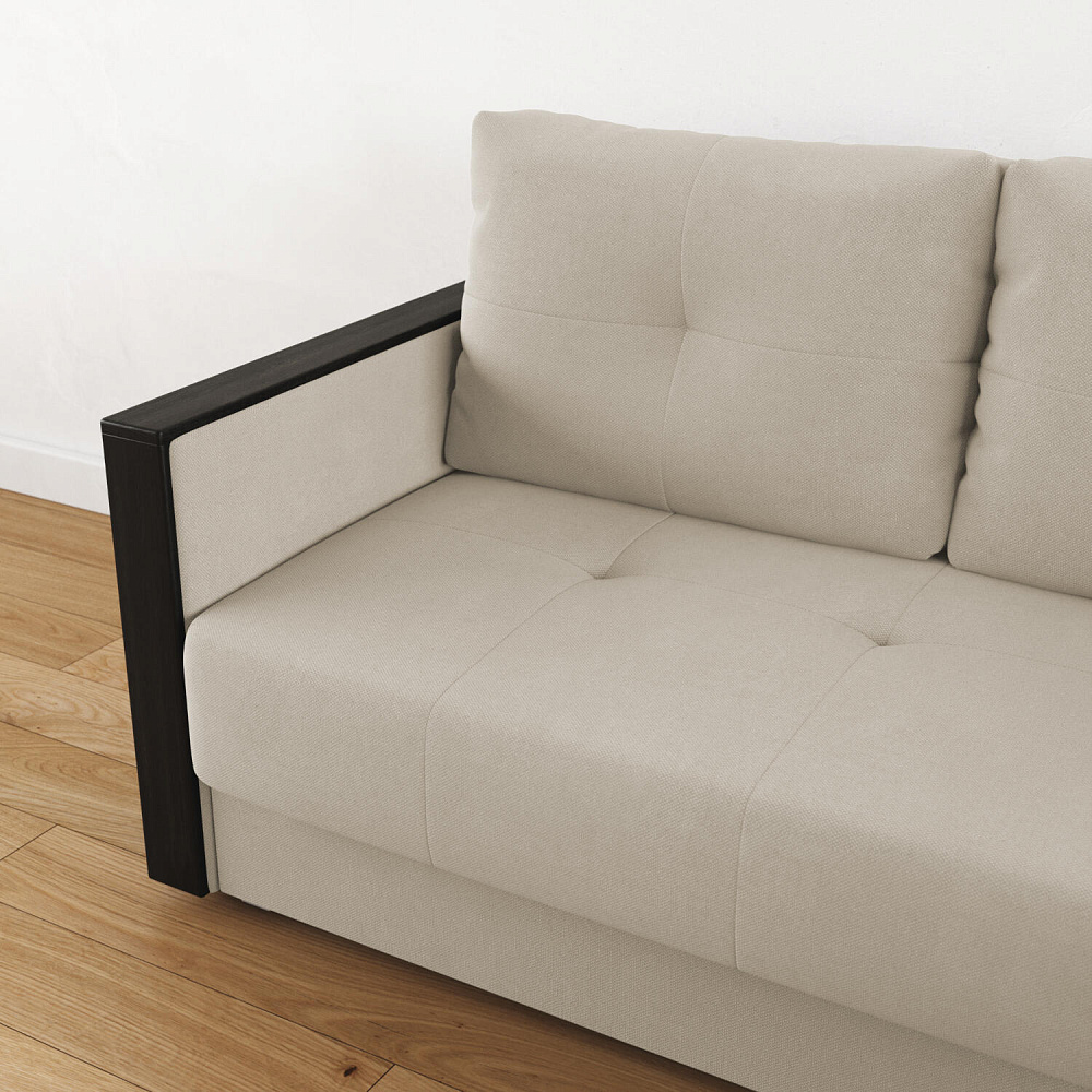 Механизм трансформации «Еврокнижка». Диван легко раскладывается: нужно выкатить вперёд сиденье и опустить спинку. Удобен механизм ещё тем, что двигается только передняя часть, поэтому отодвигать диван от стены не требуется.