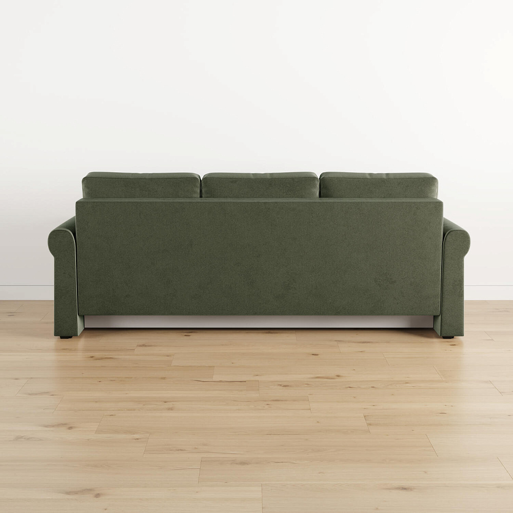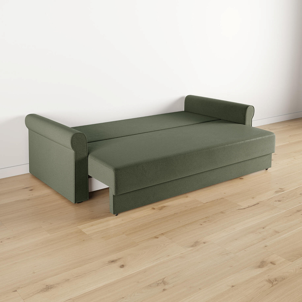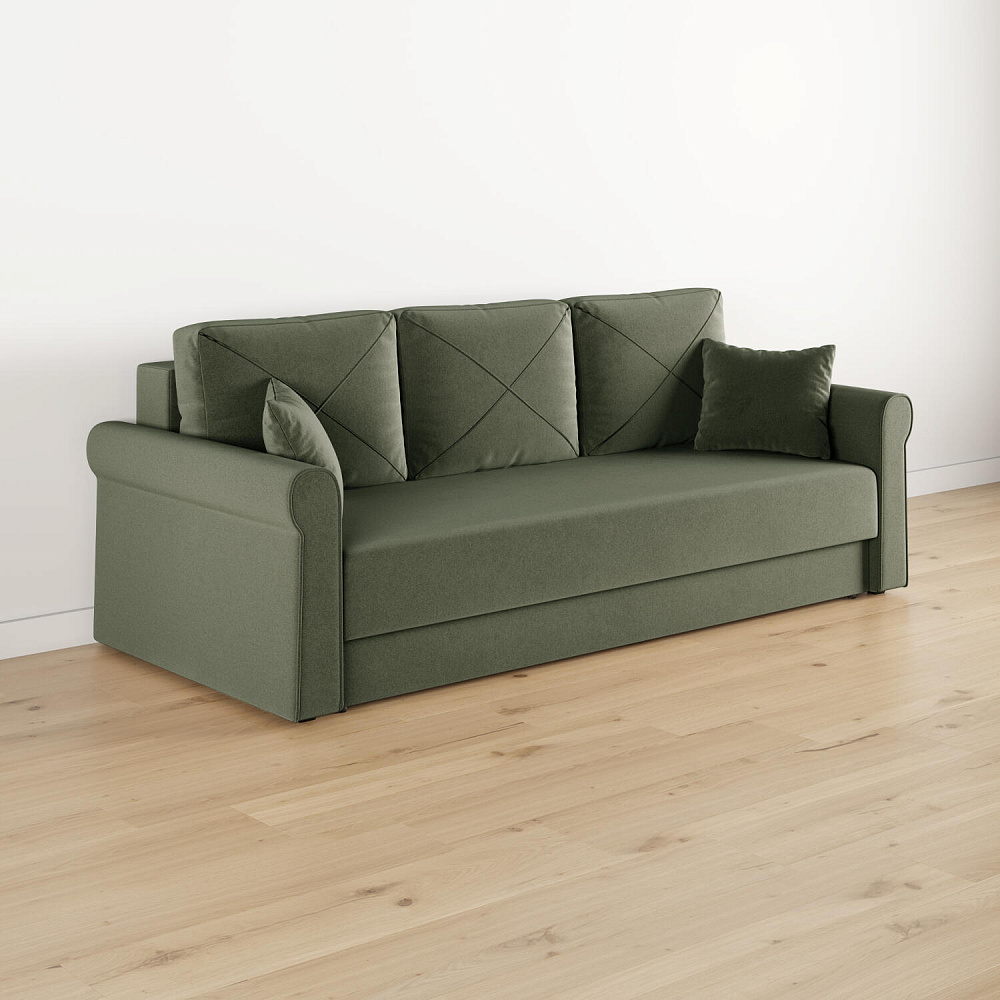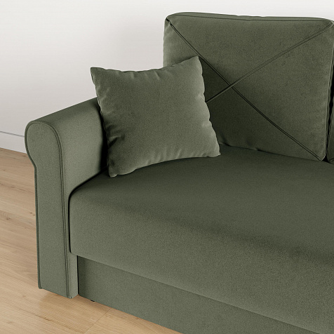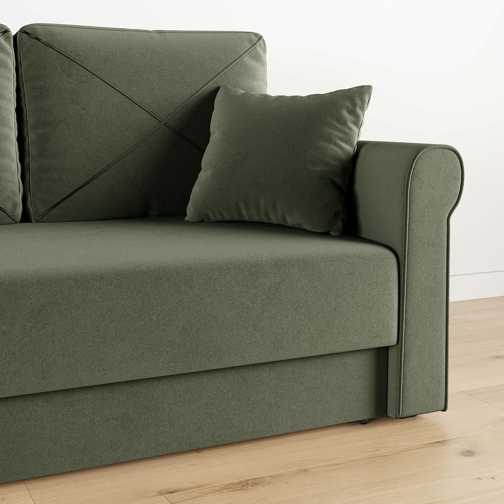 - Механизм трансформации «Еврокнижка». Диван легко раскладывается — достаточно выкатить вперёд сиденье и опустить спинку. Отодвигать диван от стены не требуется.