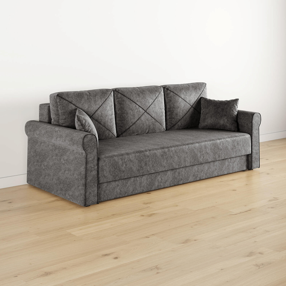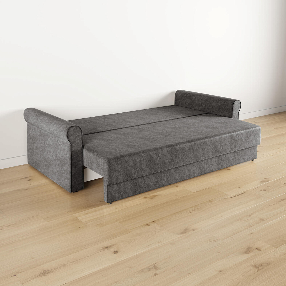 - Механизм трансформации «Еврокнижка». Диван легко раскладывается — достаточно выкатить вперёд сиденье и опустить спинку. Отодвигать диван от стены не требуется.