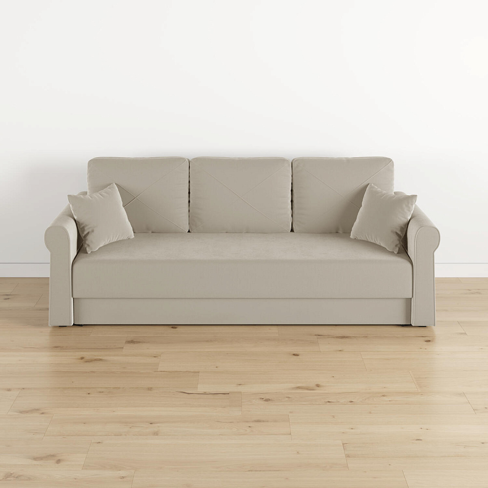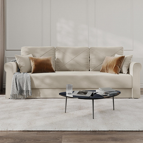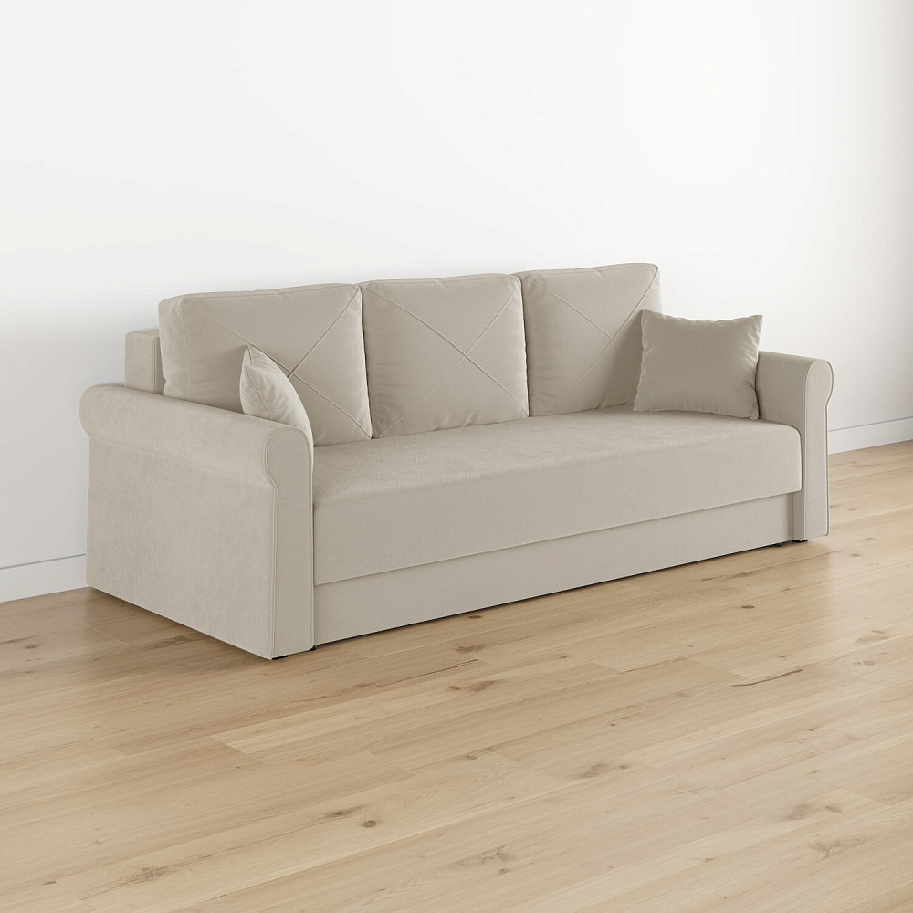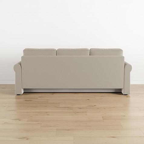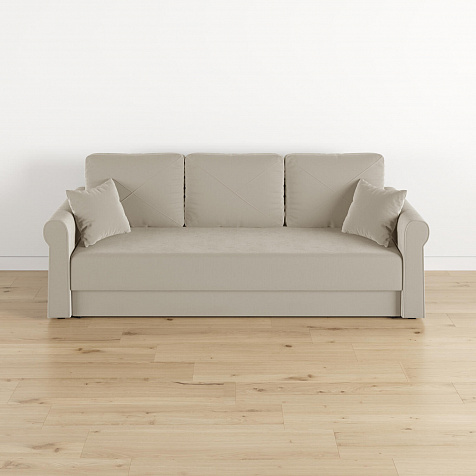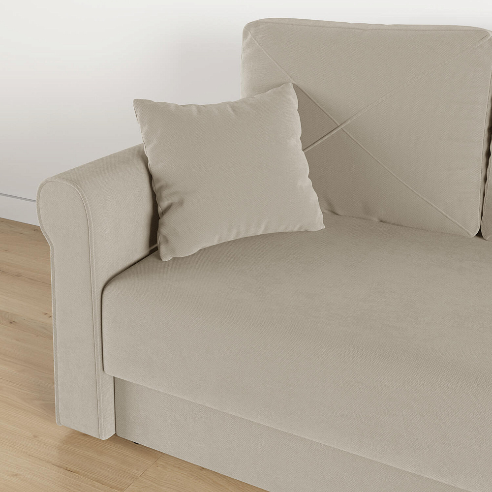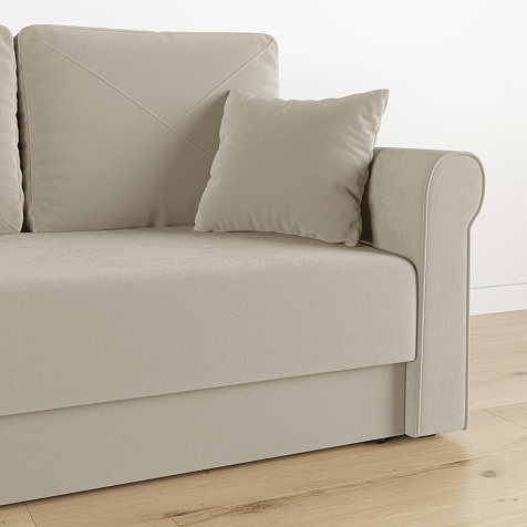 - Механизм трансформации «Еврокнижка». Диван легко раскладывается — достаточно выкатить вперёд сиденье и опустить спинку. Отодвигать диван от стены не требуется.