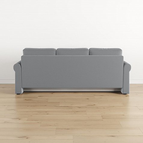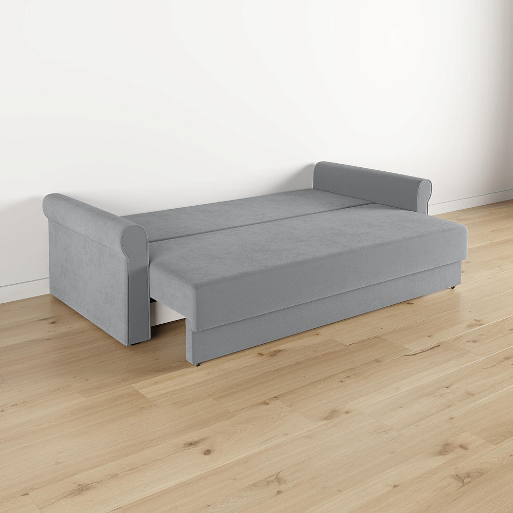 - Механизм трансформации «Еврокнижка». Диван легко раскладывается — достаточно выкатить вперёд сиденье и опустить спинку. Отодвигать диван от стены не требуется.